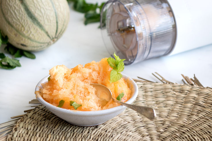 Il s’agit simplement de mixer du melon avec un peu de sucre. Le principe est ensuite de congeler la préparation et d’utiliser une râpe spéciale. Le résultat est assez proche du granité, mais en beaucoup plus fin.